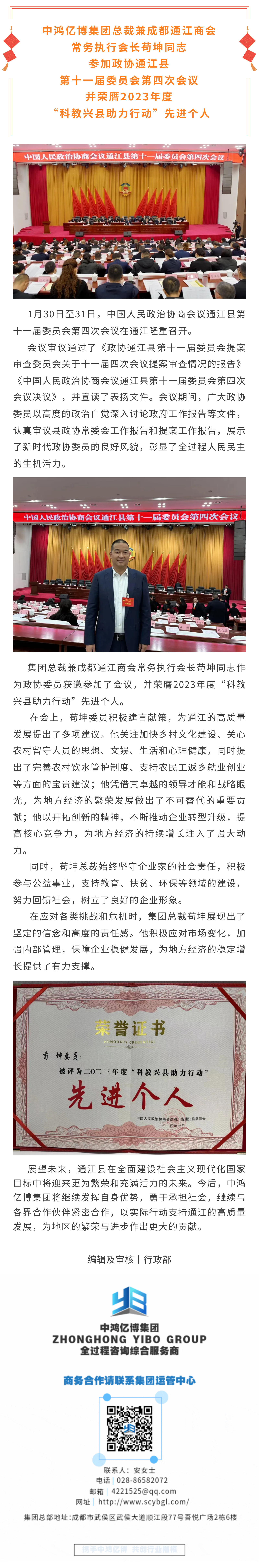 億博動態(tài)丨集團總裁茍坤同志參加政協(xié)通江縣第十一屆委員會第四次會議并榮膺2023年度“科教興縣助力行動”先進個人