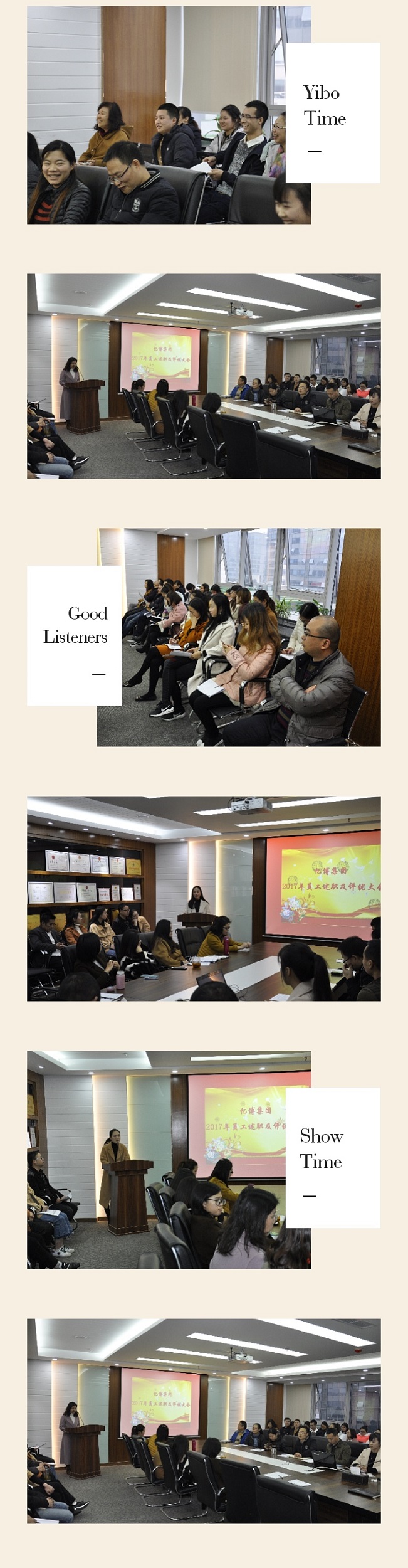 2017年12月29日辦公室全體員工年終述職及總結(jié)大會在公司1號會議廳隆重舉行,這是公司例行一年一次的年終員工盛會之一。會議由辦公室主任陳鳳遐主持,每位員工利用五分鐘的脫口秀,總結(jié)了自己在過去一年中的成績、收獲和成長,以及經(jīng)驗(yàn)和教訓(xùn),并暢想未來一年的希望和目標(biāo)。