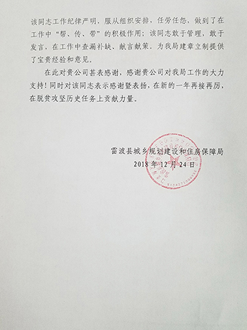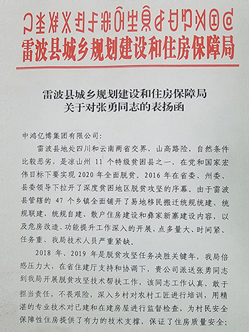 熱烈祝賀中鴻億博集團(tuán)有限公司張勇同志2018年在四川省委、涼山州委、雷波縣委的領(lǐng)導(dǎo)下參加雷波縣管轄的47個(gè)鄉(xiāng)鎮(zhèn)的易地移民搬遷統(tǒng)規(guī)統(tǒng)建、統(tǒng)規(guī)自建、散戶住房建設(shè)和彝家新寨建設(shè)內(nèi)容,以及危房建造、功能提升工作。在此次工作中由于我公司張勇同志工作積極認(rèn)真、敢于擔(dān)當(dāng)責(zé)任,不畏艱難險(xiǎn)阻,并為建設(shè)局建章立制提供了寶貴經(jīng)驗(yàn)和意見。為了感謝我公司在此次脫貧攻堅(jiān)工作中提供的技術(shù)扶貧工作的大力支持,建設(shè)局特對我公司及公司員工張勇同志給予了感謝表揚(yáng)。