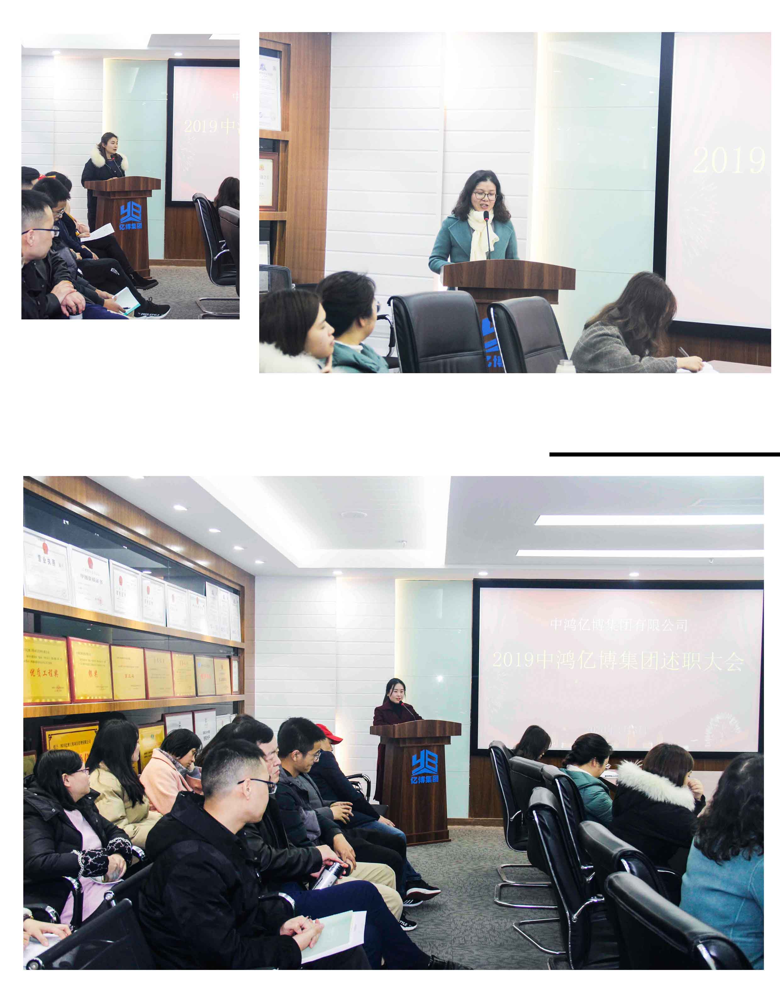 2020年1月3日,中鴻億博集團(tuán)有限公司召開工作總結(jié)大會及員工述職大會。工程部、經(jīng)營部、財務(wù)部、造價咨詢部、招標(biāo)部、人力部、行政部等七個部門全體員工參加會議,董事長茍坤,執(zhí)行董事長張敏,總經(jīng)理何涌泉出席會議。