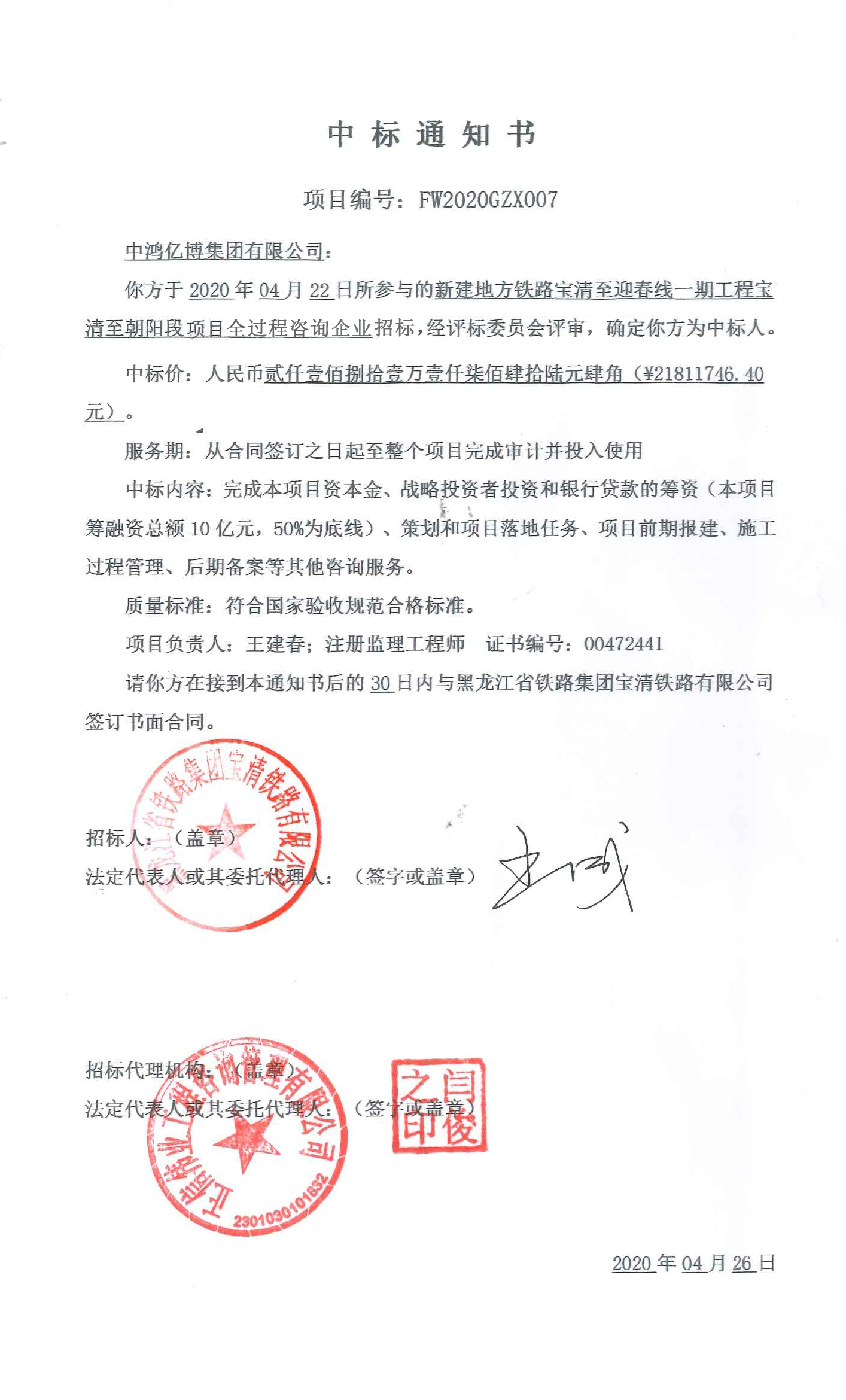 因為疫情,2020年的春天比以往任何時候來得要晚些。但對于億博人來說,再大的困難也不能束縛我們前進的腳步, 2020年04月22日億博人憑借自身過硬的實力,一舉奪得“新建地方鐵路寶清至迎春線一期工程寶清至朝陽段全過程咨詢管理公司”的中標資格。