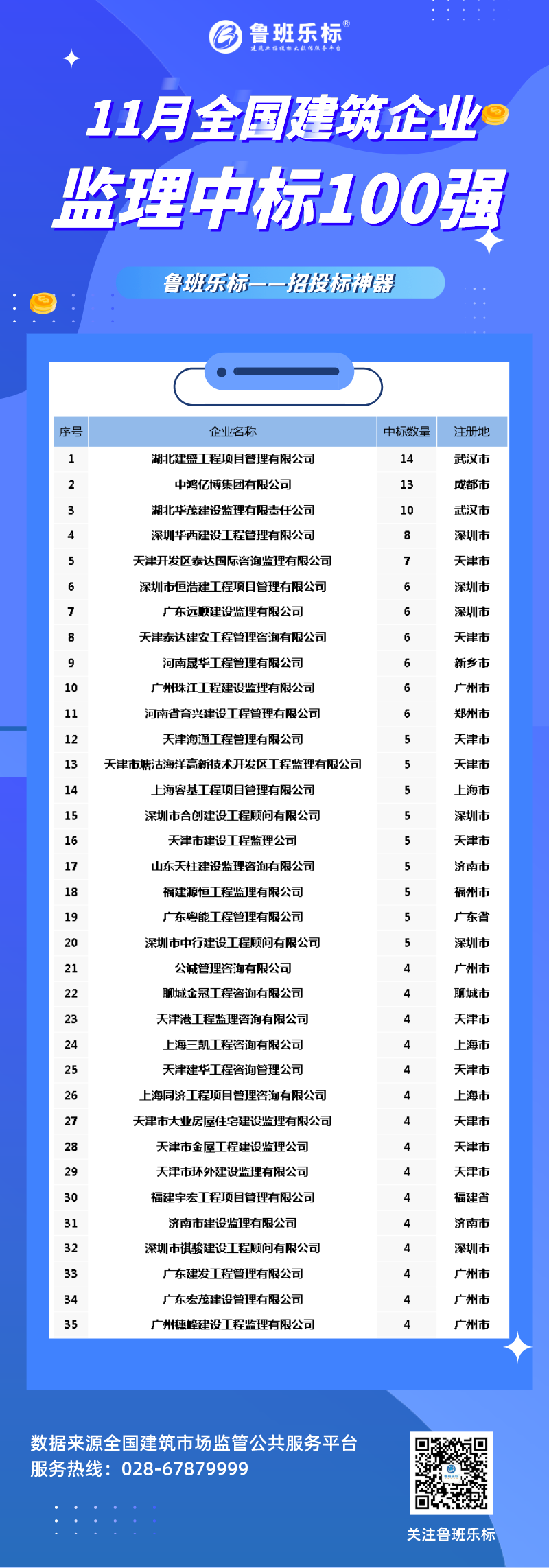 湖北建盛工程項(xiàng)目管理有限公司以中標(biāo)14個(gè)居榜首;