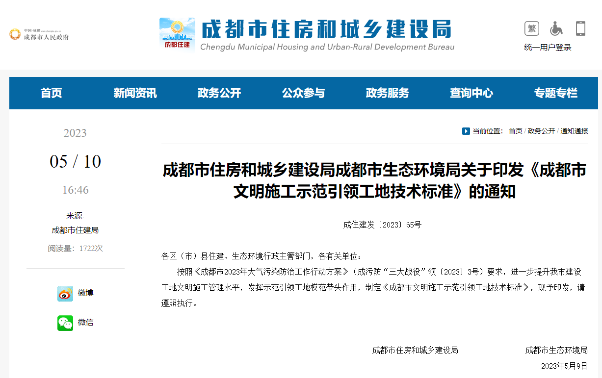 2023年5月6日,成都市住房和城鄉(xiāng)建設(shè)局成都市生態(tài)環(huán)境局印發(fā)關(guān)于《成都市文明施工示范引領(lǐng)工地技術(shù)標(biāo)準(zhǔn)》的通知。