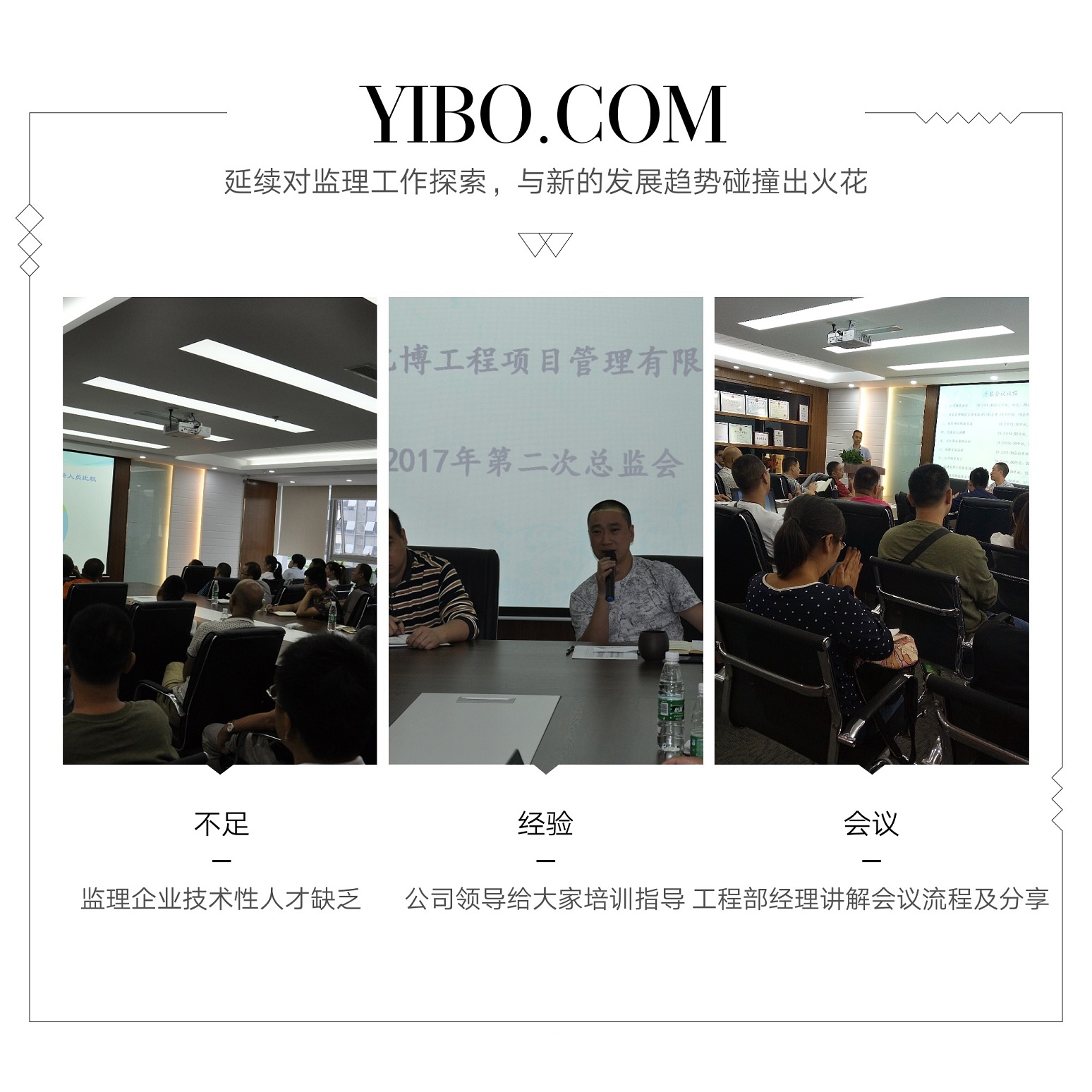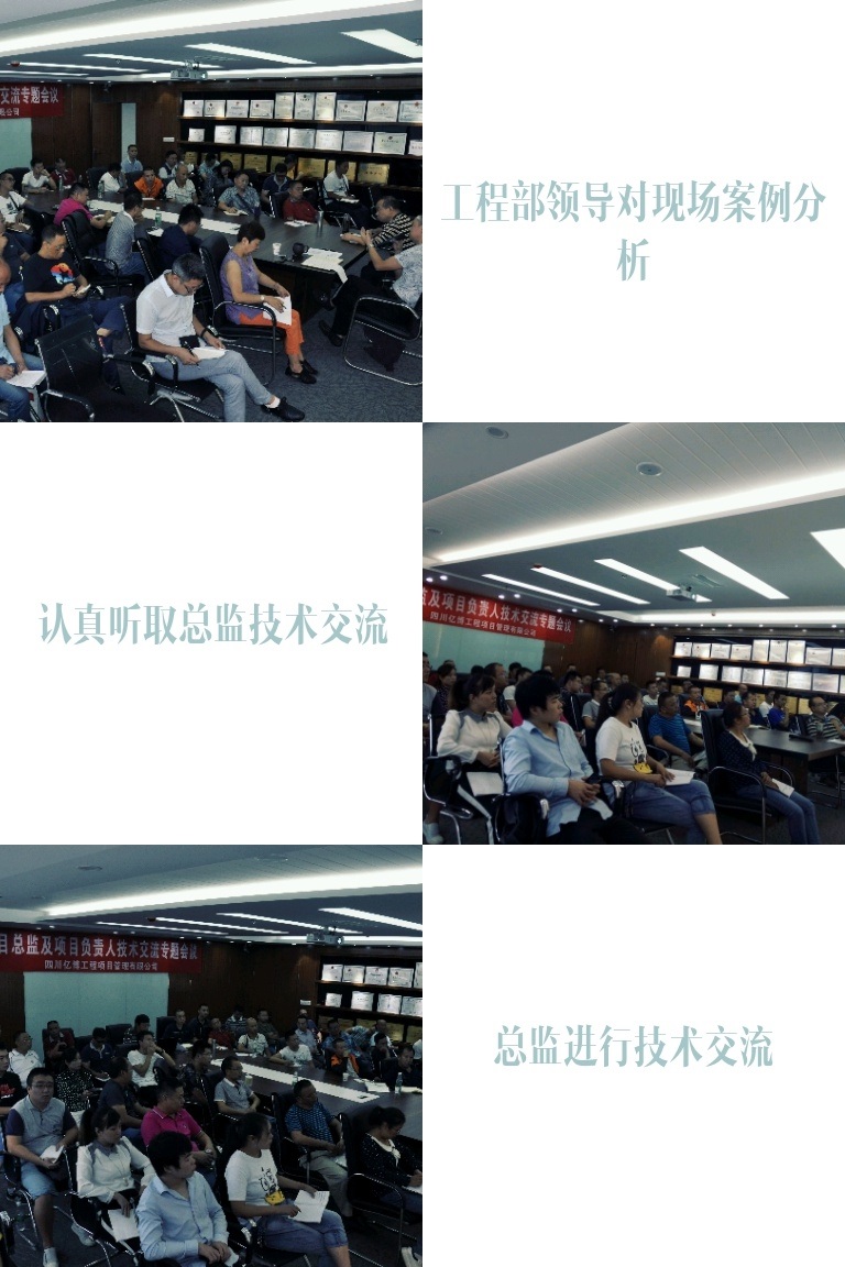 2017年9月2日,公司在總部召開了為期2天的“項(xiàng)目總監(jiān)及項(xiàng)目負(fù)責(zé)人技術(shù)交流專題會”,會議特邀專家對當(dāng)前建筑市場的形勢、發(fā)展趨勢、監(jiān)理行業(yè)現(xiàn)狀及未來發(fā)展進(jìn)行了深入透徹的分析與講解,提醒我們所有監(jiān)理人必須要認(rèn)清形勢、要有時代緊迫感和憂患意識。總工辦也圍繞會議主題組織開展了“建筑安全事故案例分析、專題論文探討、監(jiān)理工作經(jīng)驗(yàn)交流、監(jiān)理工作缺陷分析和優(yōu)秀范例品鑒”等相關(guān)會議事項(xiàng),并就下一步監(jiān)理工作質(zhì)量、監(jiān)理工作信息化管理、監(jiān)理企業(yè)信用評價管理和工程全過程咨詢工作等方面做出了詳細(xì)部署與安排。