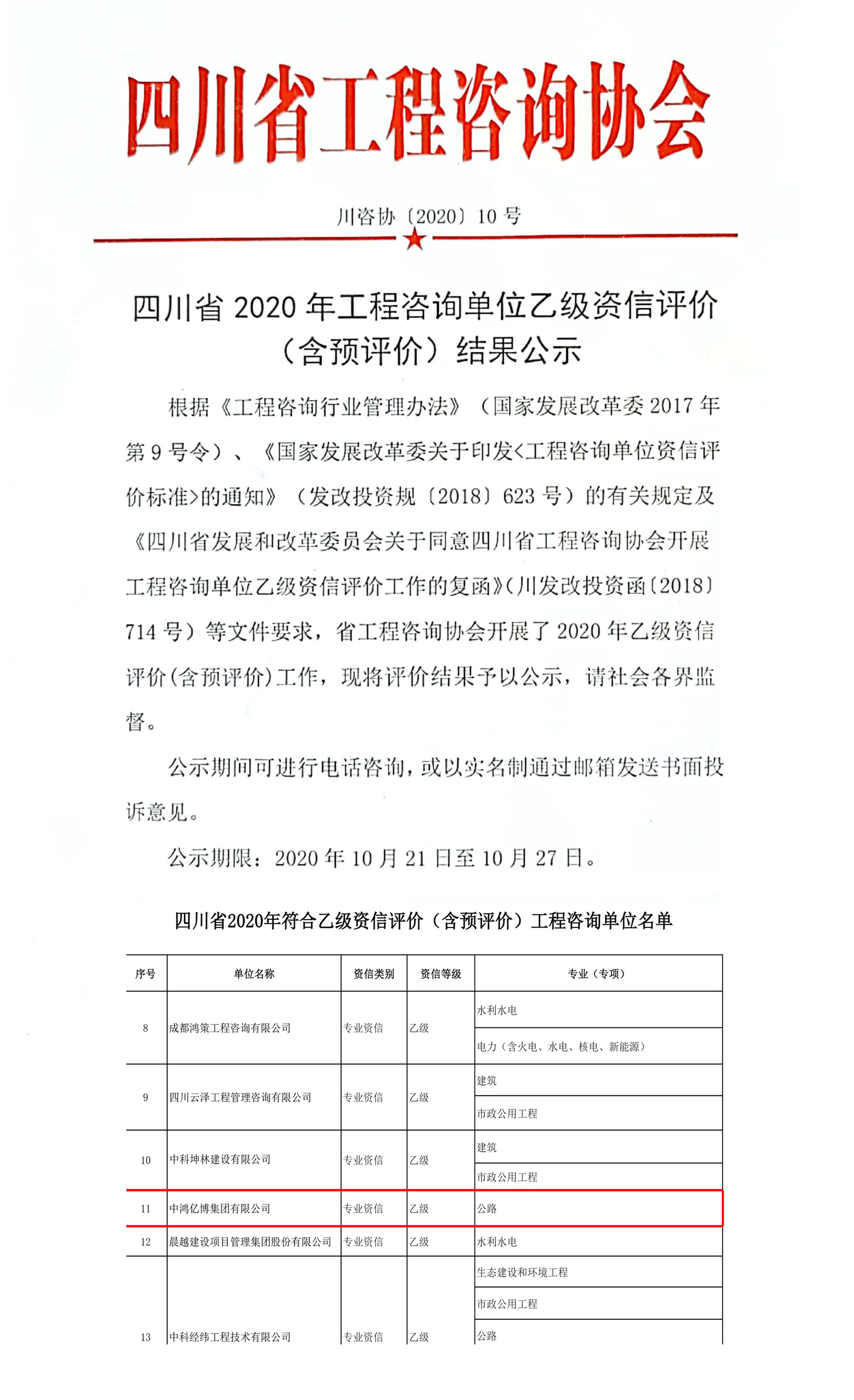 努力拼搏、不斷進(jìn)取,再獲碩果。近日,集團(tuán)傳來喜訊,根據(jù)四川工程咨詢協(xié)會(huì)2020年第10號(hào)公告,集團(tuán)成功取得四川工程咨詢協(xié)會(huì)評(píng)定的“工程咨詢單位乙級(jí)資信”。目前,集團(tuán)在工程咨詢方面已持有建筑、市政公用工程兩大專業(yè)甲級(jí)工程咨詢單位資信,此次再獲公路專業(yè)乙級(jí)工程單位咨詢資信,充分彰顯了集團(tuán)在工程咨詢領(lǐng)域強(qiáng)大的綜合實(shí)力和專業(yè)能力。