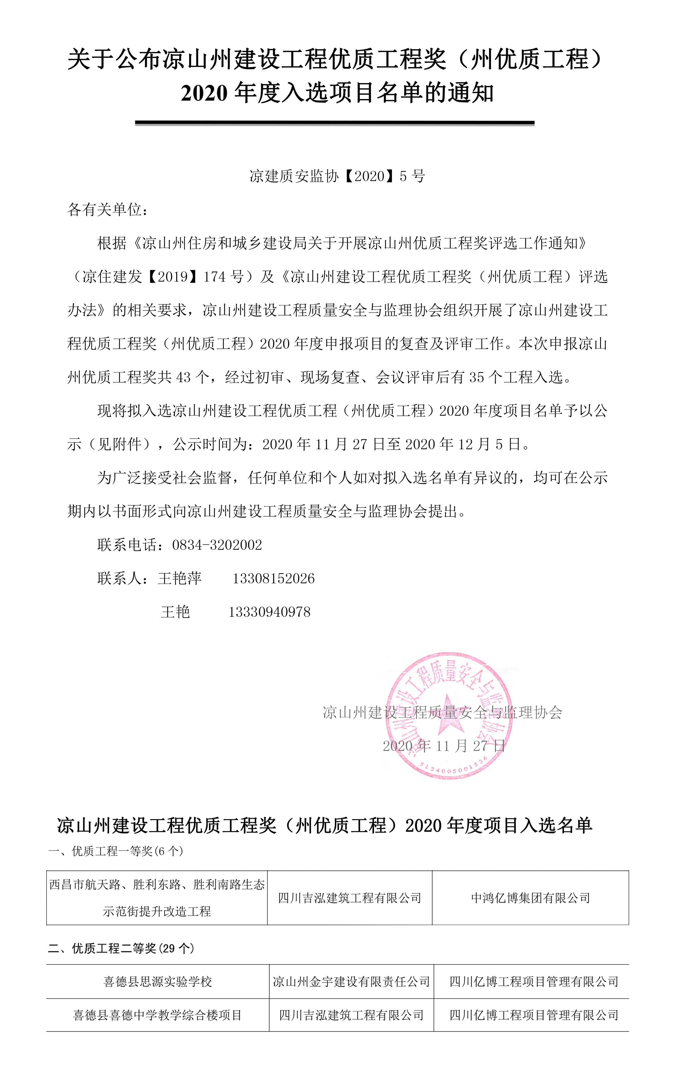 在經(jīng)歷了春的草長(zhǎng)鶯飛,夏的綠樹成蔭,秋的瓜果飄香,集團(tuán)在銀裝素裹中迎來滿滿收獲。12月,2020年度涼山州建設(shè)工程優(yōu)質(zhì)工程獎(jiǎng)入選項(xiàng)目名單公布,通過嚴(yán)格評(píng)定,集團(tuán)承監(jiān)的3項(xiàng)工程 榮譽(yù)上榜!斬獲一等獎(jiǎng)一項(xiàng)、二等獎(jiǎng)兩項(xiàng)!