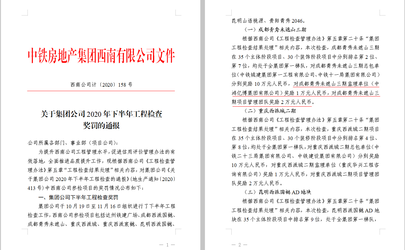 在中鐵房地產(chǎn)集團(tuán)有限公司2020年下半年度第三方工程檢查中,青秀未遮山三期(閱山府)項(xiàng)目主體階段綜合測評成績榮獲中鐵集團(tuán)第二名(35個(gè)項(xiàng)目參檢)、裝飾階段綜合測評成績榮獲中鐵集團(tuán)第七名(30個(gè)項(xiàng)目參檢),均處于中鐵集團(tuán)第一梯隊(duì)。集團(tuán)公司青秀未遮山三期項(xiàng)目監(jiān)理部受到中鐵房地產(chǎn)集團(tuán)西南有限公司通報(bào)嘉獎(jiǎng)及現(xiàn)金獎(jiǎng)勵(lì)1萬元人民幣。