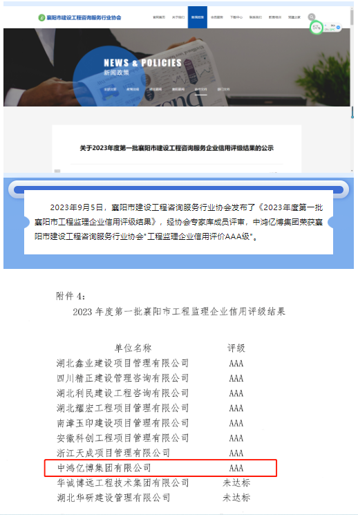 集團(tuán)榮獲襄陽(yáng)市建設(shè)工程咨詢服務(wù)行業(yè)協(xié)會(huì)“工程監(jiān)理企業(yè)信用評(píng)價(jià)AAA級(jí)”
