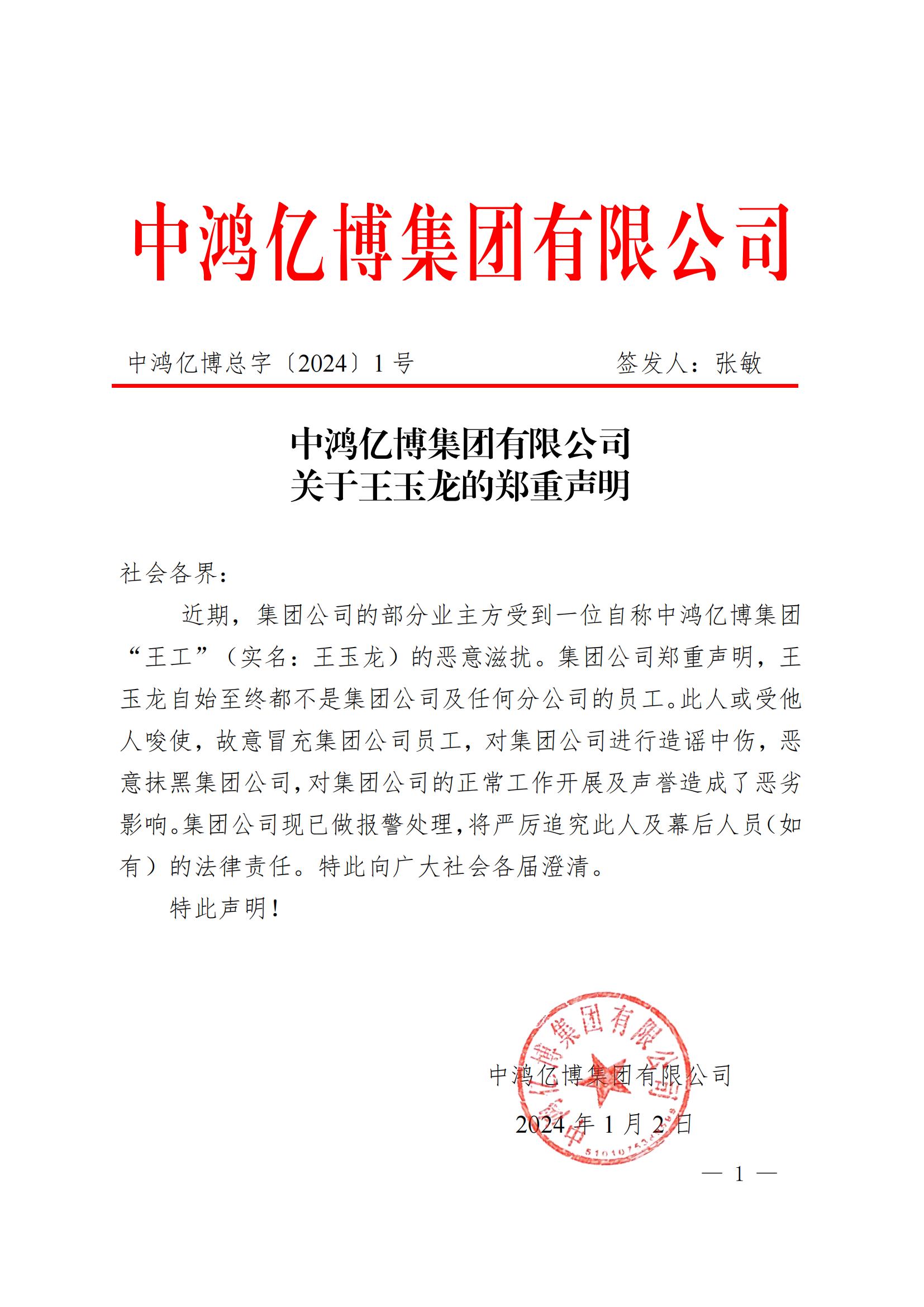 中鴻億博集團(tuán)有限公司 關(guān)于王玉龍的鄭重聲明